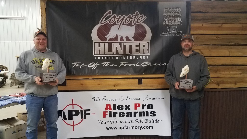 Scott Larson and Troy Sand take 1st place with 13 coyotes to win the 17NDCC took home plaques, 2 - APF Armory Firearms, and $1,626.00