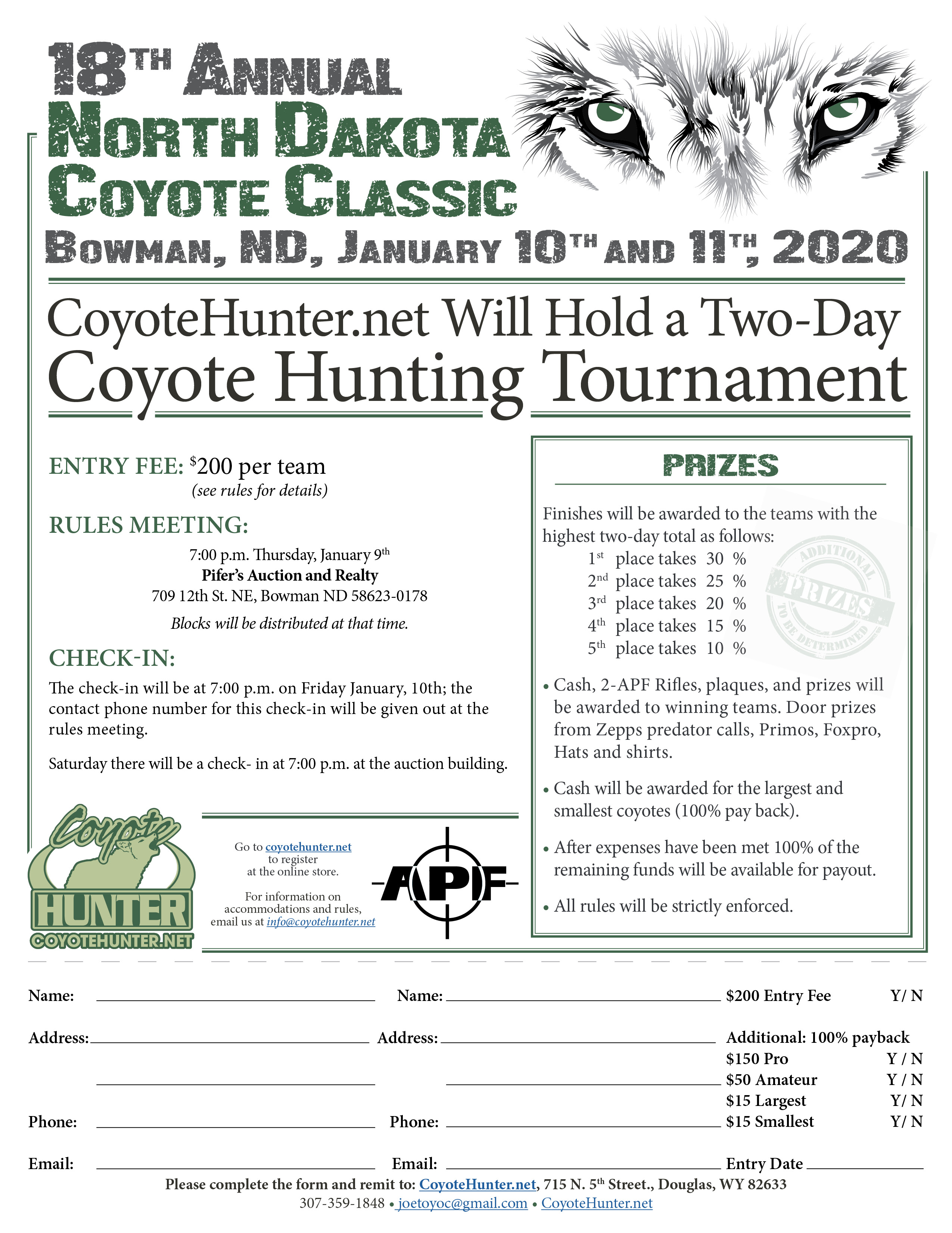 a two-day coyote hunting tournament will be held in Bowman, ND Friday & Saturday January 11 &12, 2019. There will be a mandatory rules meeting at 7:00 p.m. Thursday January 9th at Pifer’s Auction and Realty 709 12th St. NE, Bowman ND, the 7:00 p.m. Blocks will be distributed at that time.