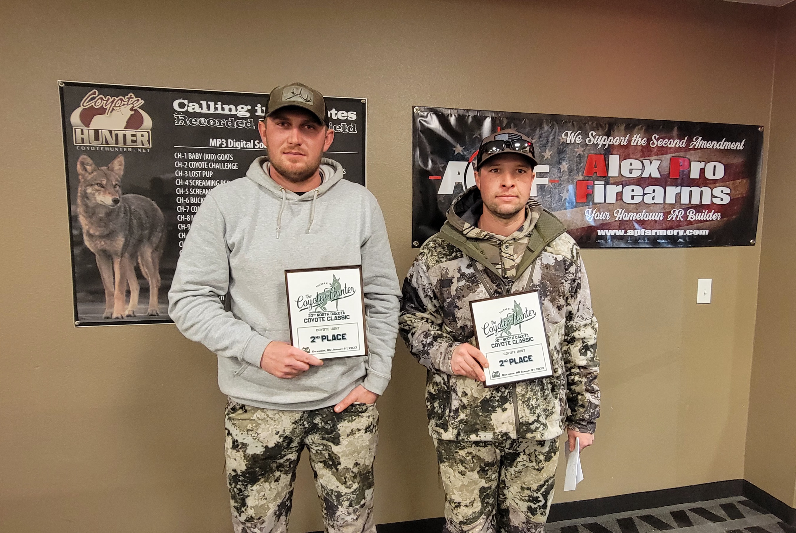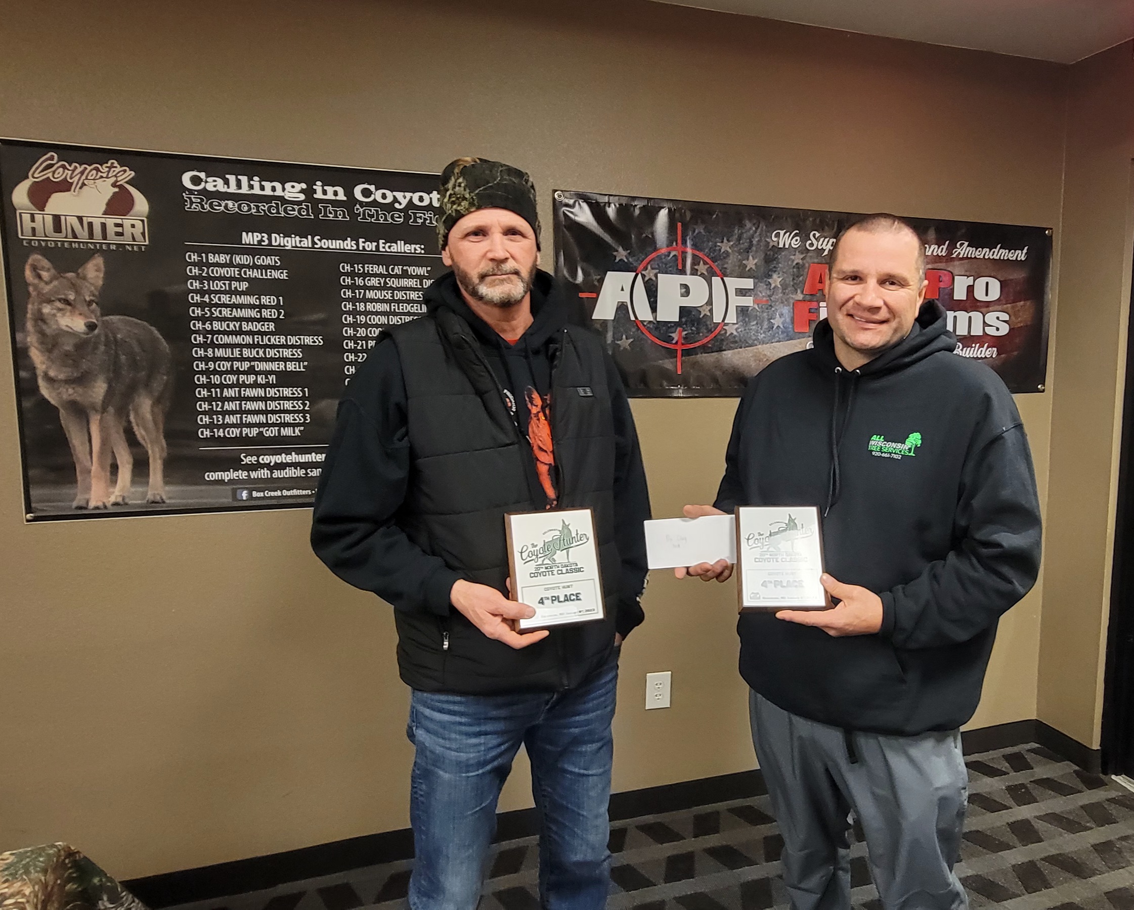 2nd Place goes to Kasey Boyer and Cody Zastoupil (1st place amatuer div.) with 3 coyotes (+6.3 lbs) received $865, 2 APF Slim Carbine 5.56 NATO and Plaques. 3rd Place goes to Aaron Anderson and Emett with 3 coyotes (2nd place pro div.) bringing them $850, 2 APF Slim Carbine 5.56 NATO and Plaques. 4th place with 2 coyotes (+11lbs) goes to Ryan Jahner and Joe Freybler (3rd place pro div.) $390 and Plaques. 5th place went to Ryan Lyson and Ryan Wade with 2 coyotes take home Plaques. Forest Balvitsch and Michael Amb with 1 coyote take 2nd place amatuer div. paying $105 3rd place amatuer div. goes to Levi Temple and Josh Peterson with 1 coyote paid $70