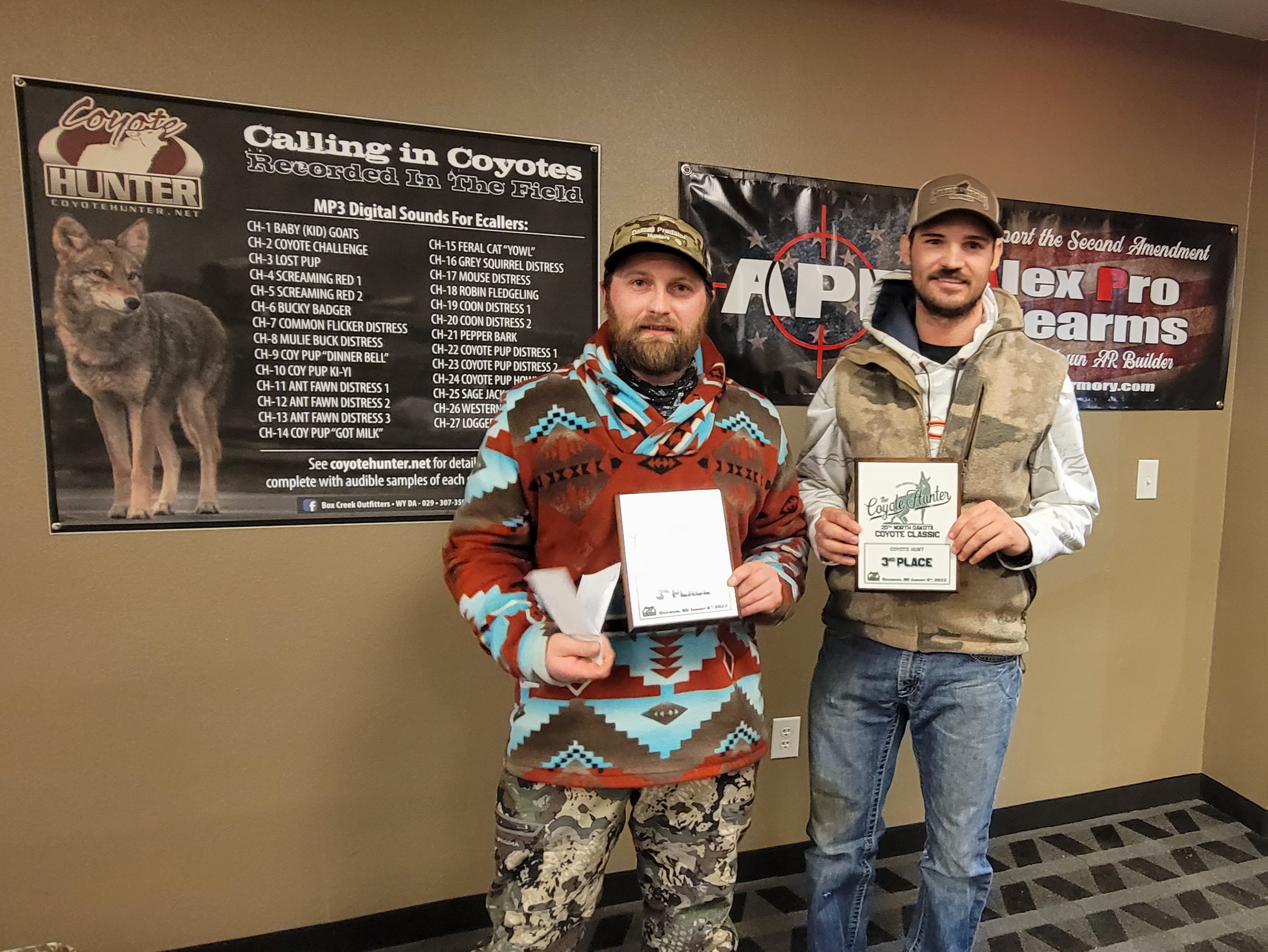 2nd Place goes to Kasey Boyer and Cody Zastoupil (1st place amatuer div.) with 3 coyotes (+6.3 lbs) received $865, 2 APF Slim Carbine 5.56 NATO and Plaques. 3rd Place goes to Aaron Anderson and Emett with 3 coyotes (2nd place pro div.) bringing them $850, 2 APF Slim Carbine 5.56 NATO and Plaques. 4th place with 2 coyotes (+11lbs) goes to Ryan Jahner and Joe Freybler (3rd place pro div.) $390 and Plaques. 5th place went to Ryan Lyson and Ryan Wade with 2 coyotes take home Plaques. Forest Balvitsch and Michael Amb with 1 coyote take 2nd place amatuer div. paying $105 3rd place amatuer div. goes to Levi Temple and Josh Peterson with 1 coyote paid $70